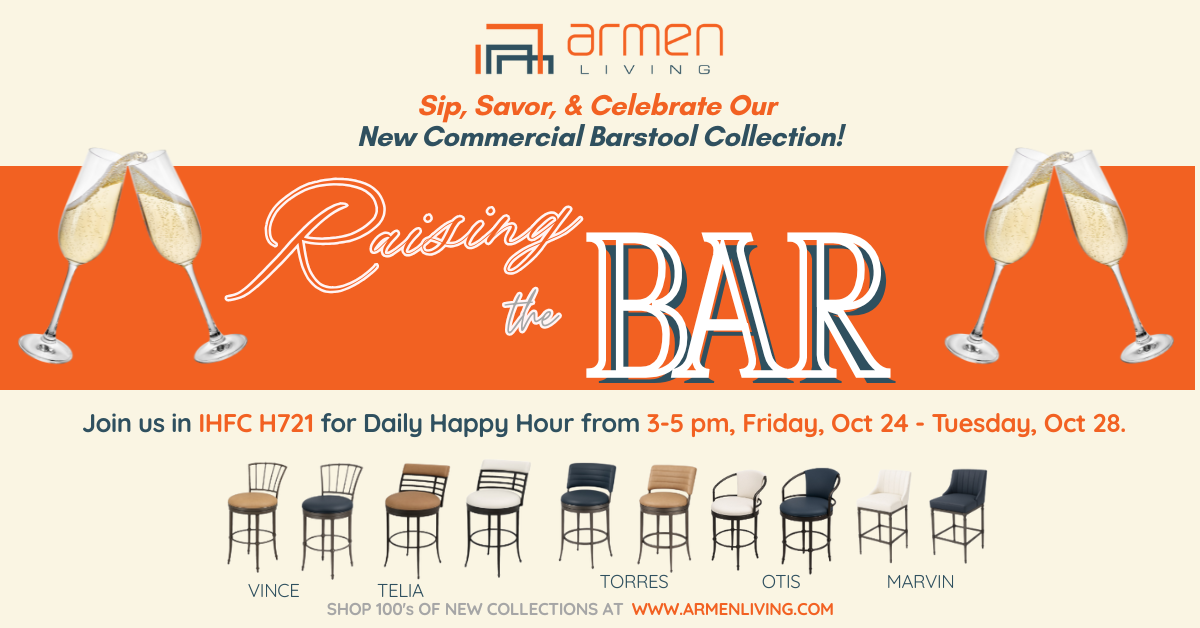 “Join us as we Raise the Bar, and celebrate the debut of Armen Living’s Commercial Barstool Collection. Our new barstool and counter stool collections offer a wide variety of modern, contemporary and traditional designs with prices you simply can’t beat!” Armen Living’s National Sales Manager, Reb Nicholson said. Armen Living will host Daily Happy Hour Events in their IHFC showroom H-721 from 3-5 pm starting on Friday, October 24, through Tuesday, October 28, 2025. Daily Happy Hour events will celebrate 100’s of new designs, and walk buyers through their showroom.