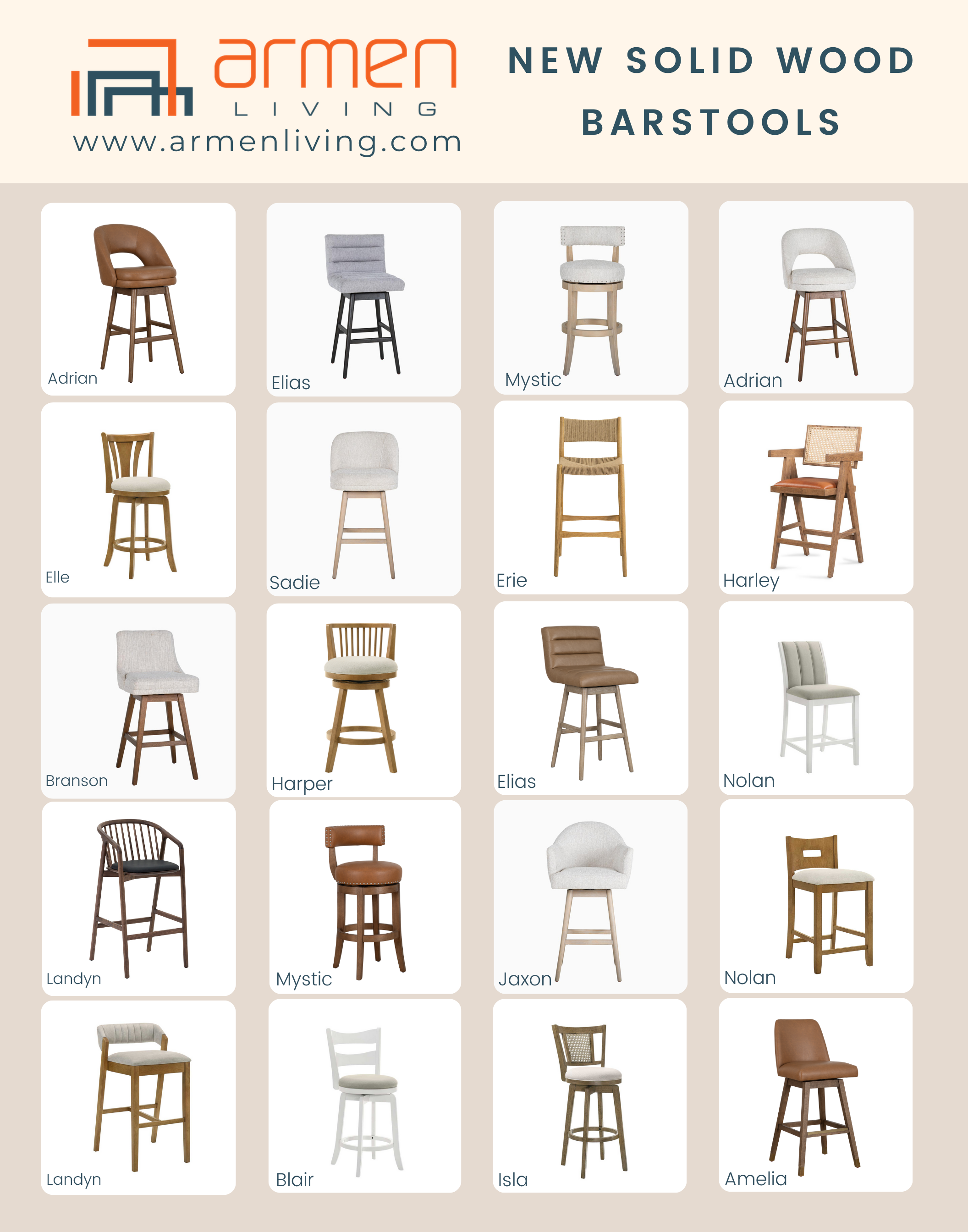 ​Armen Living’s fall debut will feature 40+ Solid wood barstools, with beautiful natural wood, paired with high-performance fabrics, and available in a variety of stylish designs.