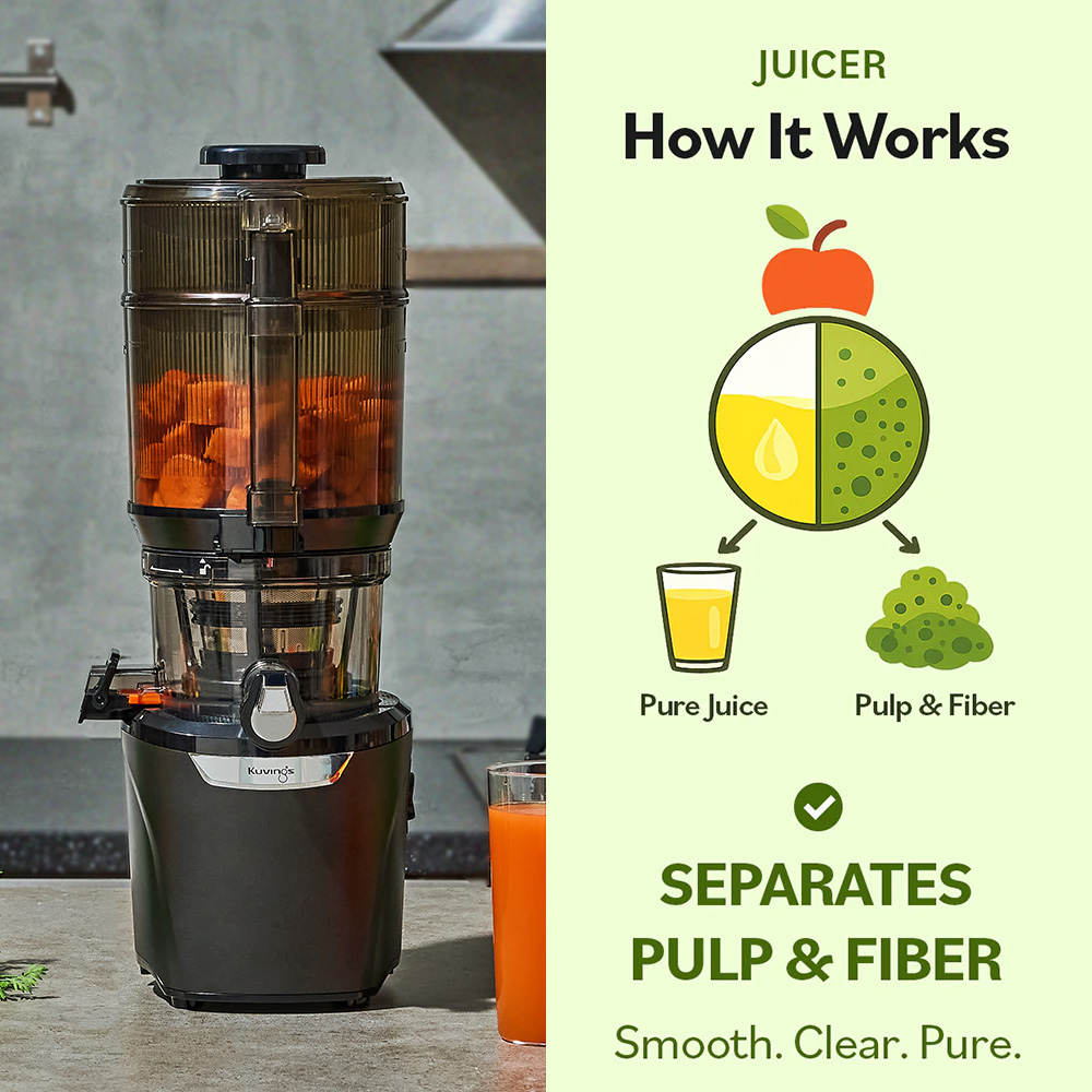 A juicer works by slowly pressing fruits and vegetables to extract juice, producing clean, cold-pressed beverages with a refined texture. By separating fiber and solids, it delivers a lighter and smoother drinking experience. The low-speed pressing method minimizes heat and oxidation, helping maintain the natural quality of ingredients while reducing nutrient loss.