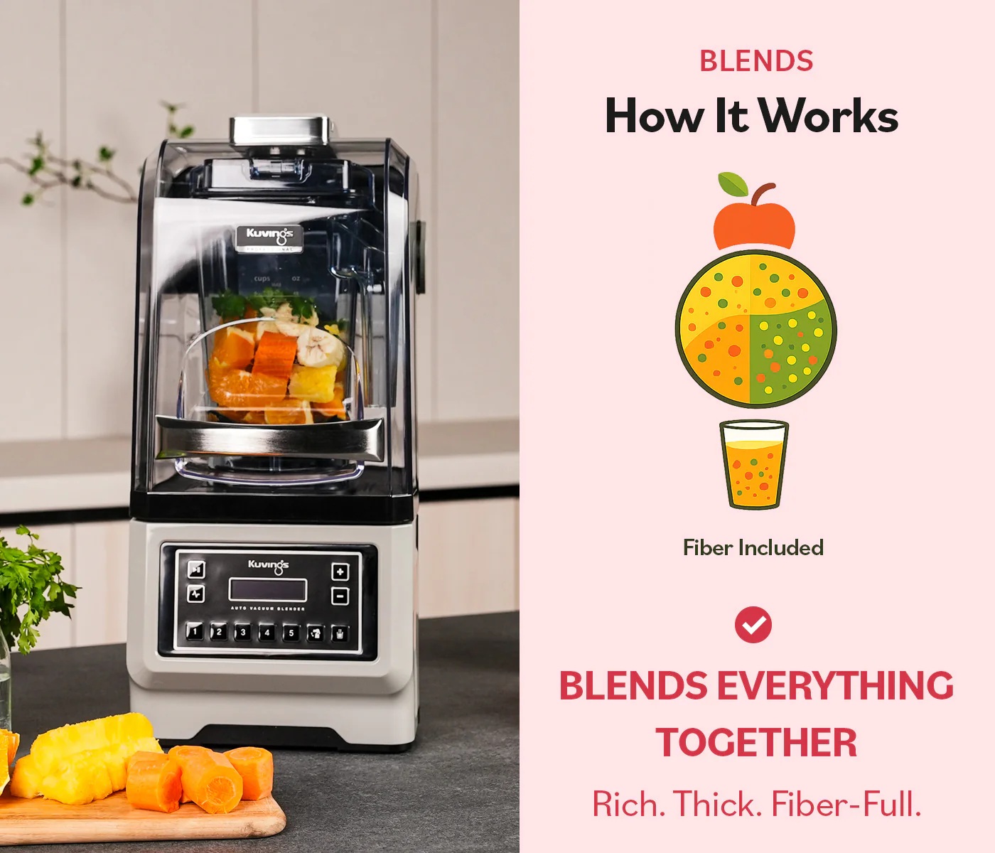 The Kuvings CB1000 features a powerful motor and high-speed blending technology to process a wide range of ingredients quickly and evenly.