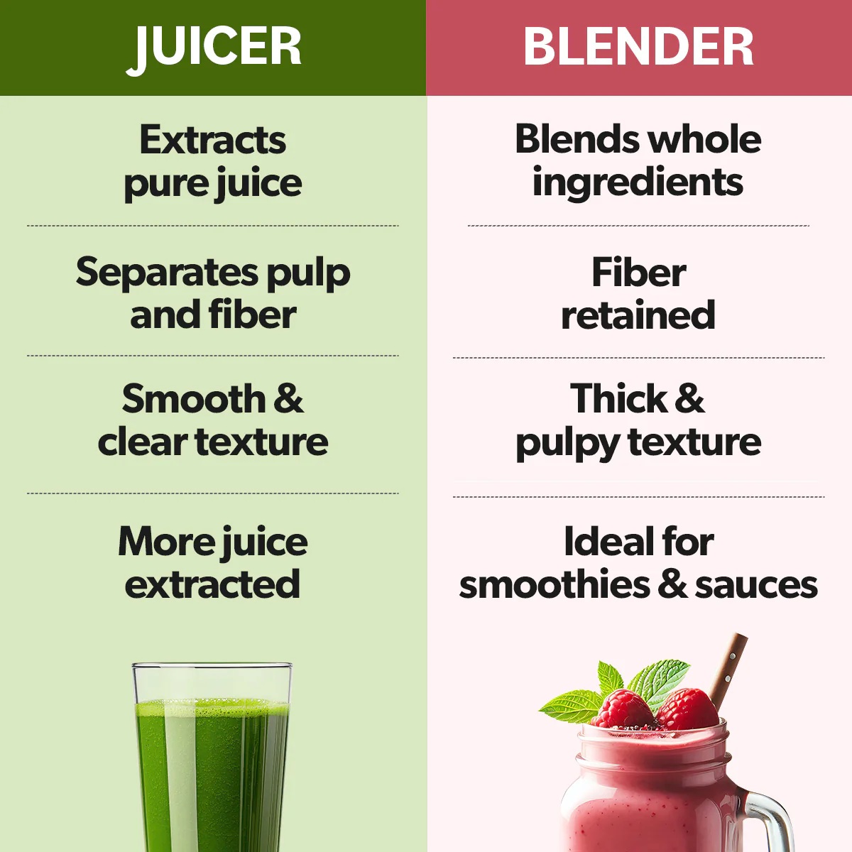For smooth juice, choose a juicer; for thick drinks, choose a blender.
