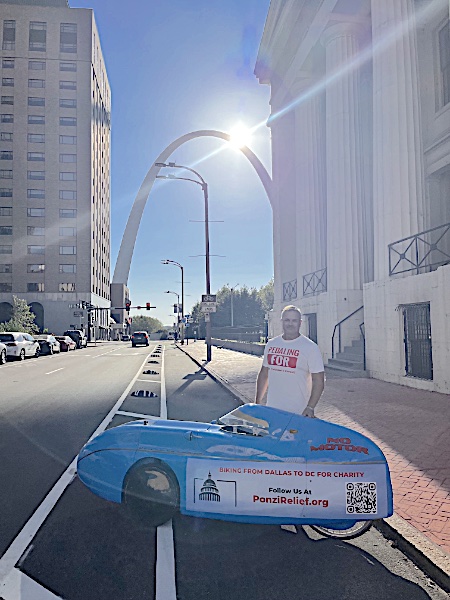 Cyclist pedals 2,000 miles from Dallas to DC in a no-motor velomobile to raise awareness for victims of Ponzi schemes via PonziRelief.org