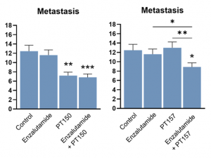 PT157, a next-generation dimeric analog of PT150, achieved synergistic reduction in metastasis when combined with Enzalutamide, delivering enhanced therapeutic potential where conventional agents fail to impact metastatic progression. Beyond its synergistic antimetastatic effect with enzalutamide, PT157 also reduced primary tumor burden (data available upon request). These results indicate that next-generation PT157 merits advancement for combination therapy aimed at controlling both primary and metastatic disease.